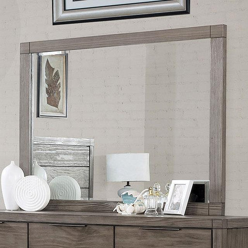 With its clean-lined look and modern attitude, this mirror is a fresh style awakening. A warm gray hue over replicated oak grain easily complements...